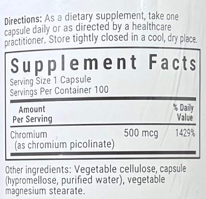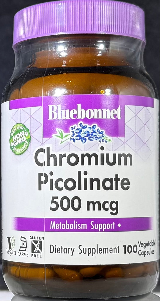 Bluebonnet's Chromium Picolinate 500 mcg Capsules provide pure yeast-free chromium in a chelate of picolinic acid. Available in easy-to-swallow vegetable capsules for maximum assimilation and absorption.