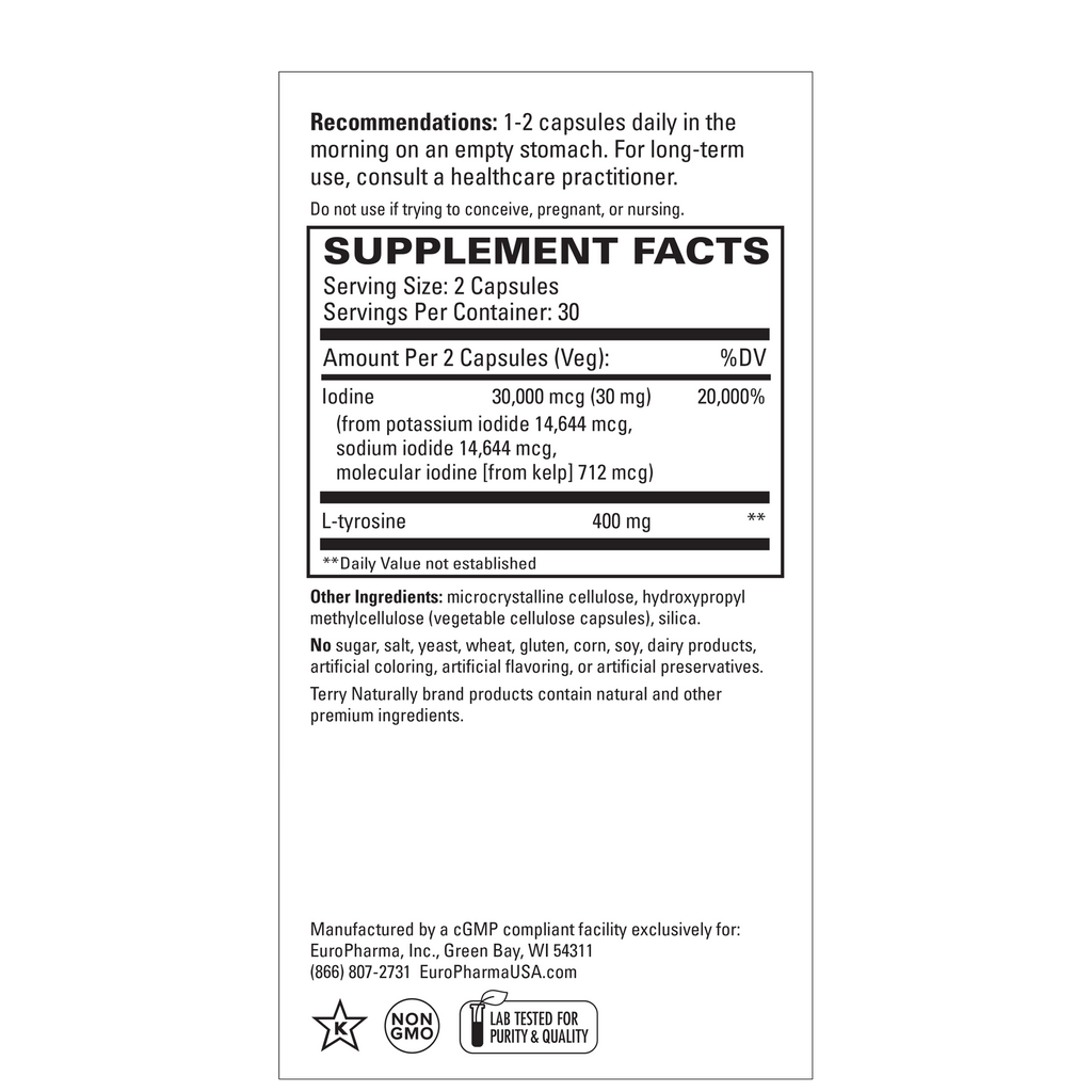 Iodine in three forms, including potassium iodide, sodium iodide, and molecular iodine for thyroid hormone synthesis, which in turn supports a healthy metabolism, lustrous hair, and hormone balance.*
